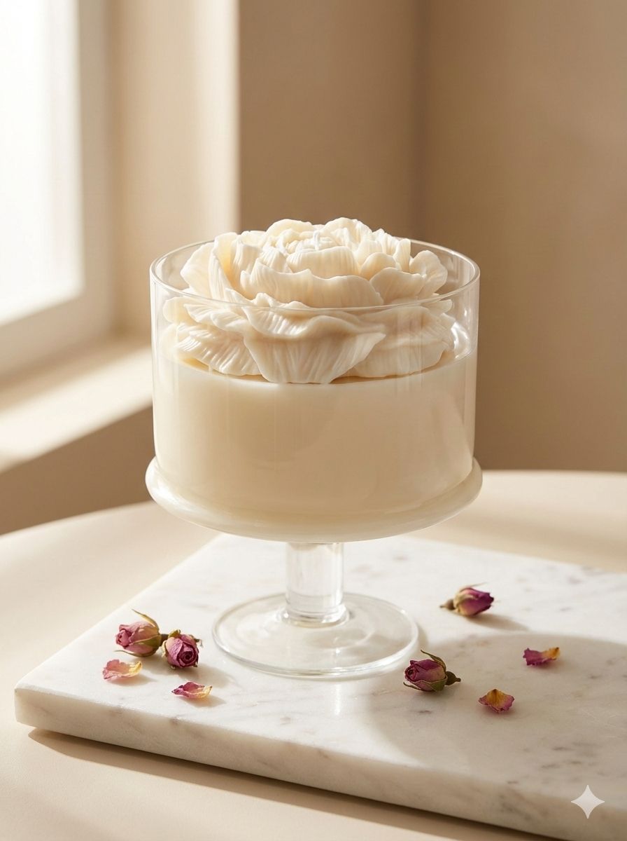 Lumen & Lux Exclusieve Kaars in Glas op Voet - Grote Witte Bloem (Pioenroos) - Handgemaakte Sfeerkaars -Luxe Woondecoratie & Bruiloft Cadeau