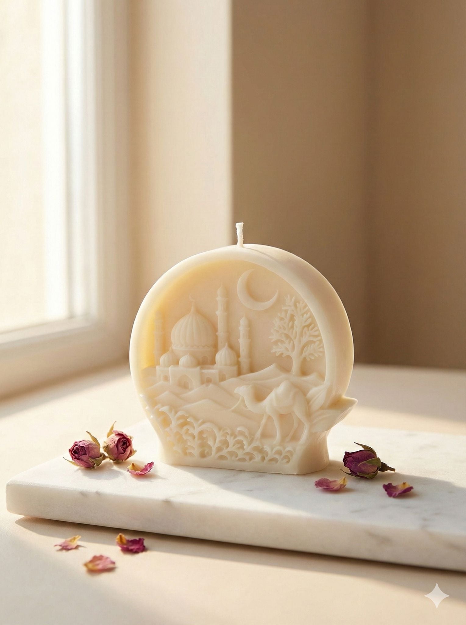 Breng warmte, rust en spiritualiteit in huis met deze prachtige handgemaakte reliëfkaars. De kaars toont een verfijnd 3D-ontwerp van een oosters landschap met een moskee, minaretten, een kameel, palmbomen en een maansikkel. Een echte blikvanger die perfect past bij Ramadan, Eid, of als stijlvolle decoratie in elk interieur.